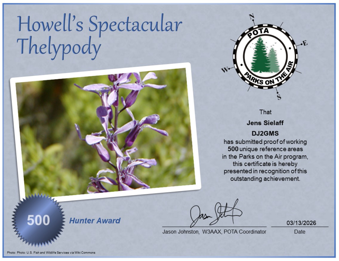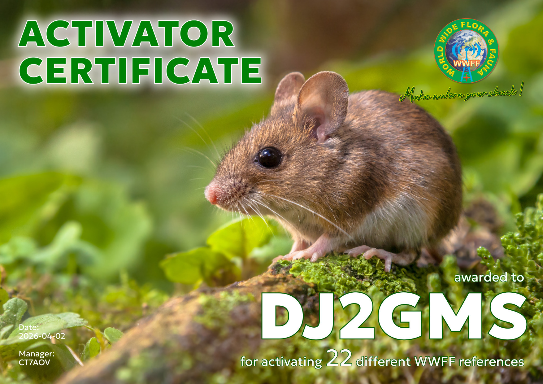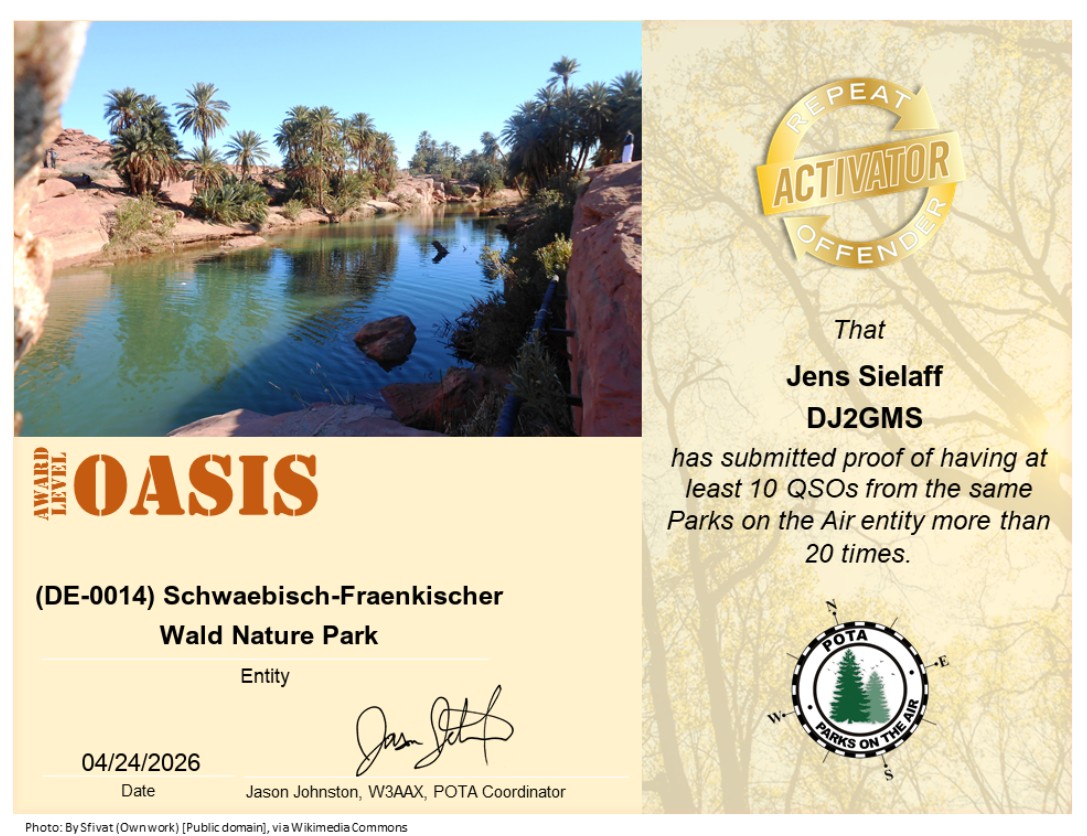 Activation of POTA DE-0221 Waldheide Recreation Park Initial-Activation of POTA DE-1225 Kochertal Schwäbisch Hall - Künzelsau Natura 2000 Initial-Activation of POTA DE-1230 Oberes Bühlertal Flora and Fauna Reserve Initial-Activation of POTA DE-1242 Württembergischer Weinwanderweg National Historic Trail